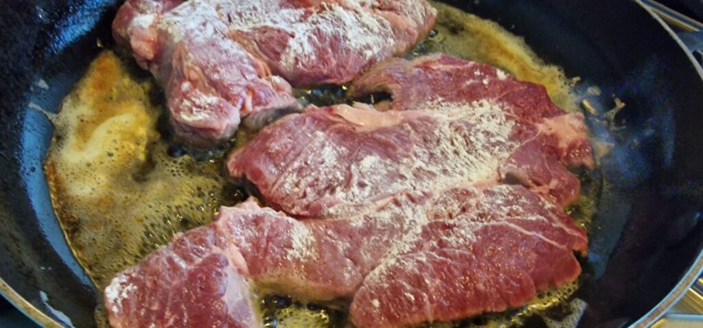 Bestrooi het vlees met peper, zout en de bloem